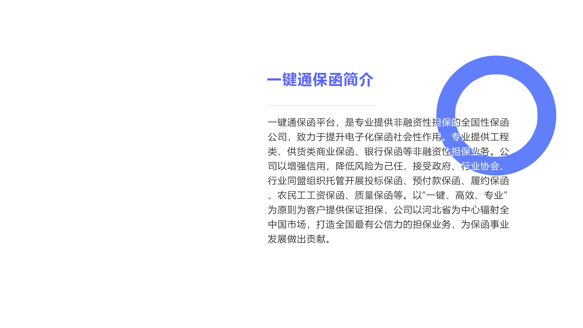 一键通保函平台,是专业提供非融资性担保的全国性保函公司,致力于提升电子化保函社会性作用。专业提供工程类、供货类商业保函、银行保函等非融资性担保业务。公司以增强信用,降低风险为己任,接受政府、行业协会、行业同盟组织托管开展投标保函、预付款保函、履约保函、农民工工资保函、质量保函等。以“一键、高效、专业”为原则为客户提供保证担保,公司以河北省为中心辐射全中国市场,打造全国最有公信力的担保业务,为保函事业发展做出贡献。