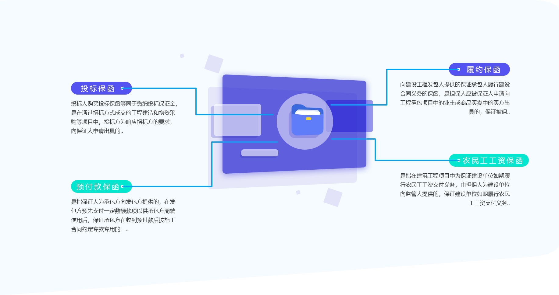 一键通保函平台,是专业提供非融资性担保的全国性保函公司,致力于提升电子化保函社会性作用。专业提供工程类、供货类商业保函、银行保函等非融资性担保业务。公司以增强信用,降低风险为己任,接受政府、行业协会、行业同盟组织托管开展投标保函、预付款保函、履约保函、农民工工资保函、质量保函等。以“一键、高效、专业”为原则为客户提供保证担保,公司以河北省为中心辐射全中国市场,打造全国最有公信力的担保业务,为保函事业发展做出贡献。